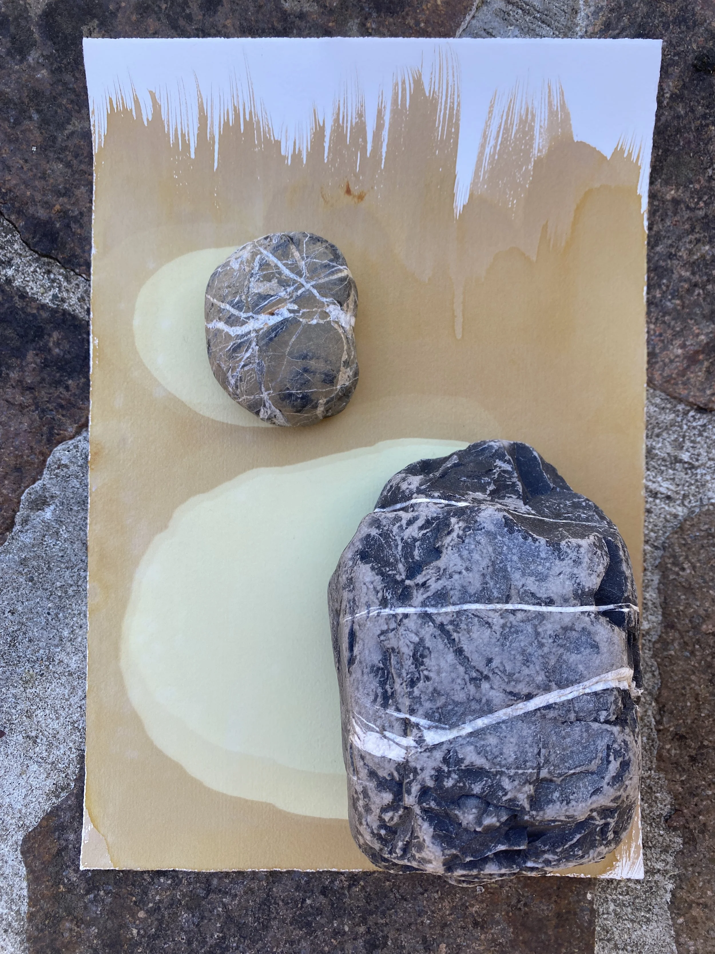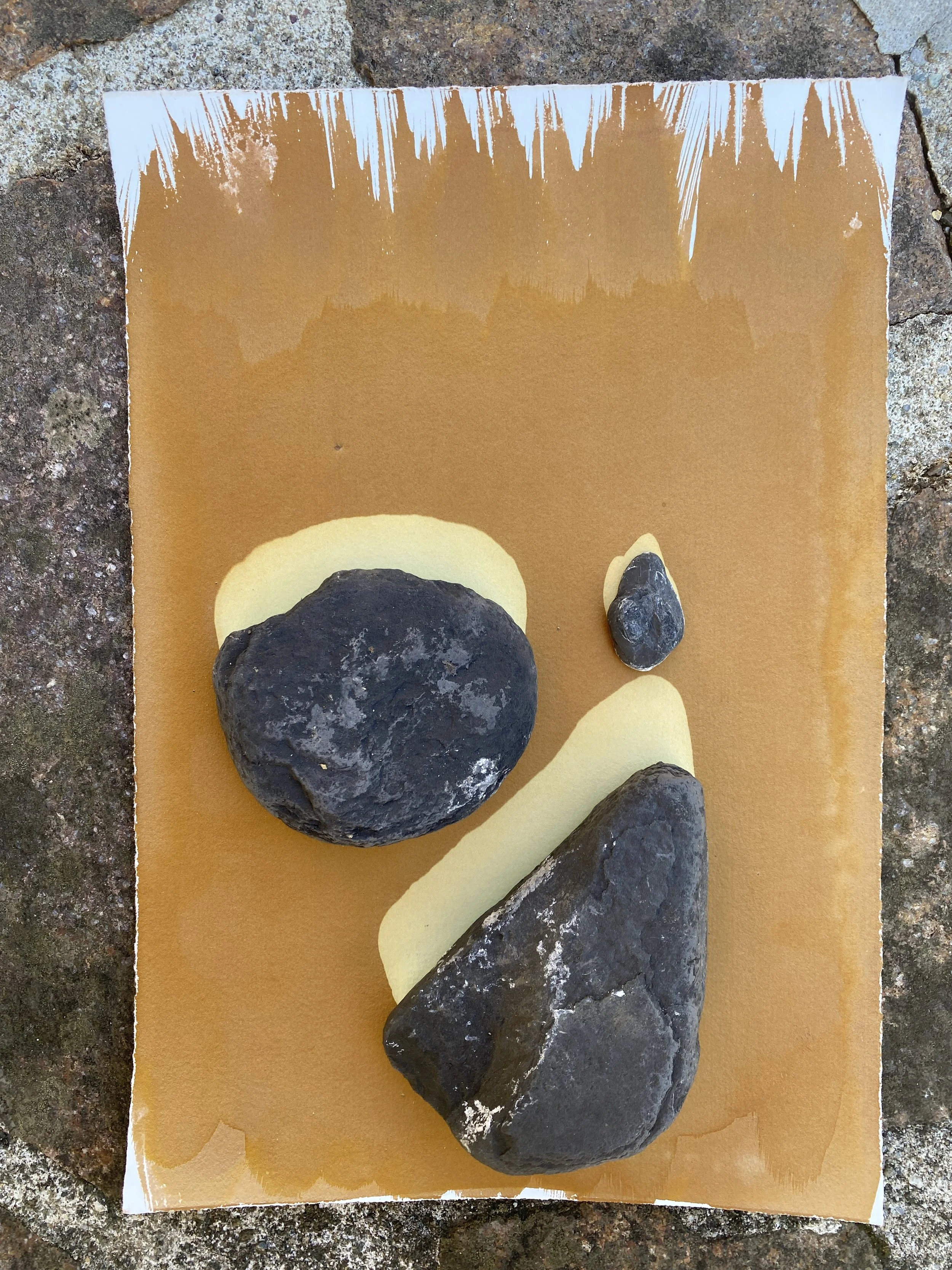 Minerals are active agents that shape both natural systems and human interventions. Minerals are part of our very biology from the iron in our blood to the sodium in our neuronal pathways. The connection to the land is inextricable to anywhere humans call home. This artwork engages in mineral memory by exposing the transition of material through a visible transformation from object rock to art object. The stones are from the pre-alpine landscape of Val Taleggio and nearby valleys and each were selected during hikes and explorations in distinct locations. Stones were collected from a local Arabescato Orobico marble mine, and from the Enna, Asinina, and Salzana rivers in Val Taleggio, the Taleggio valley. The stones were rinsed, sketched, and photographed. Each stone was set on paper prepared with a UV light sensitive emulsion and then placed in bright morning or evening sunlight to produce photographic prints and shadows. The photographic emulsions are made from iron, calcium, magnesium, silver, ground stone, gum arabic, and soil pigment. Through the printing process the geology of the rock and the minerals of the photographic process become both subject and medium.
